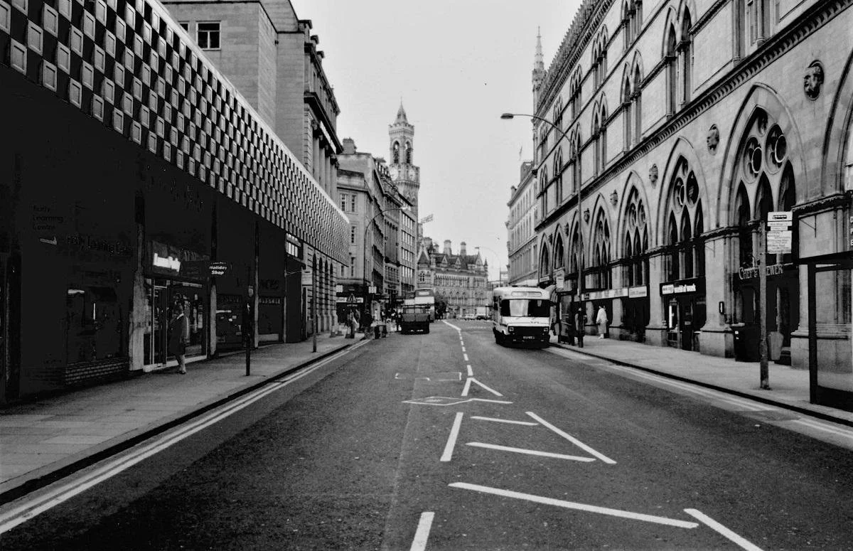 My first memories of Bradford city centre are to do with touch, smell, a sort of smoky diesel damp! The mills were still working full throttle and the chimneys spewing smoke and soot hell for leather so town was jet black buildings, blue Bradford Corporation buses and endless queues outside the town hall to get on them at teatime when the place was packed. On every corner a toothless nicotine coloured gentleman would roar 'Telleeegrraaaaafffff!!!!' and the copies, delivered with military efficiency by a fleet of yellow T&A vans hurtling all over the district would literally fly off the pile.
